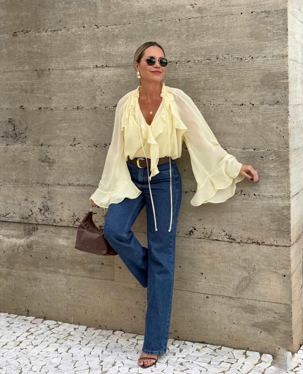 Шифоновая блуза с расклешонным рукавом и рюшами в зоне декольте. Цвет лимон.
