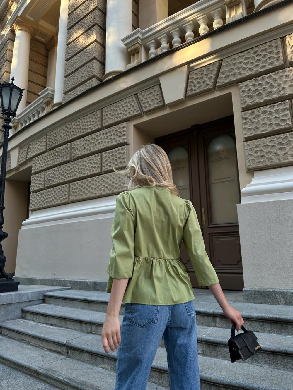 Рубашка оригинального кроя с рукавом 3/4 и завязкаси спереди. Цвет оливковый.