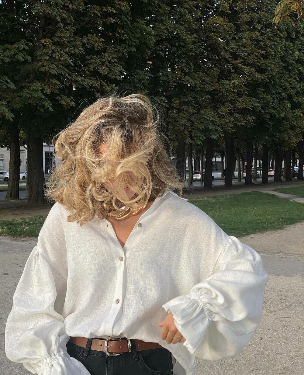 Рубашка оверсайз с объемным рукавом на резинке, застегивается на пуговицы. Цвет белый.