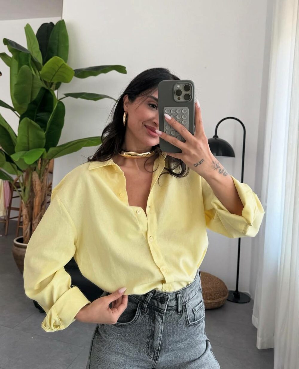 Рубашка оригинального кроя, которая сейчас находится на самом пике популярности. А расслабленный крой и очень красивая палитра оттенков — абсолютная любовь всех современных девушек. Она 100% станет настоящим хитом. Цвет желтый.