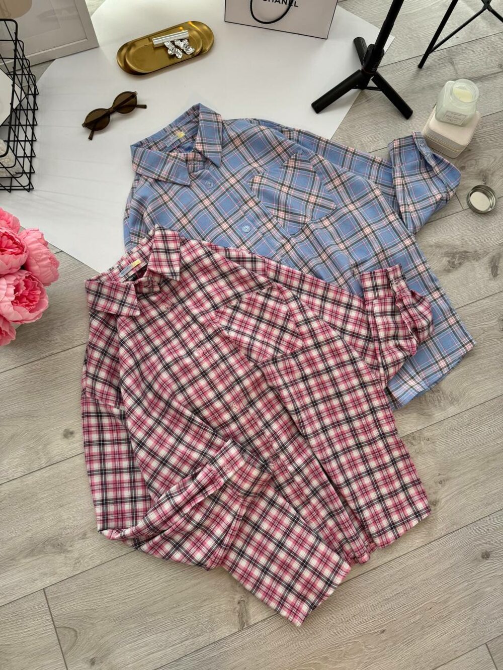 Базовая рубашка оверсайз в клетку, цвет розовый.