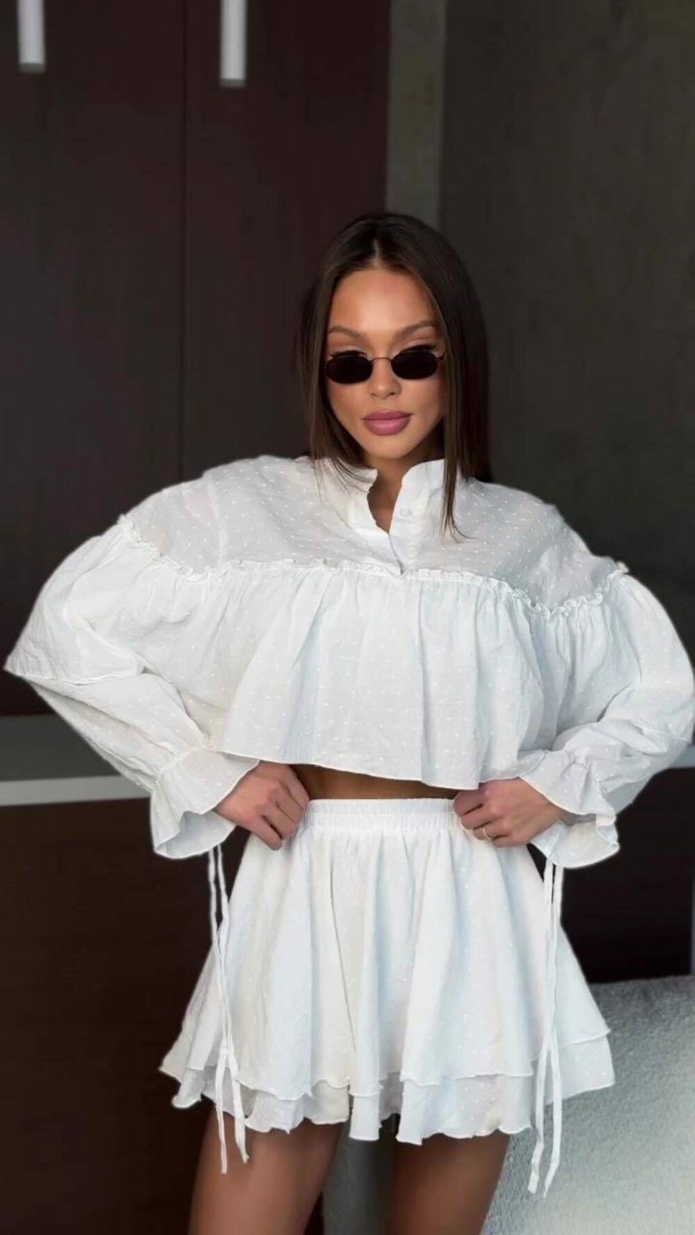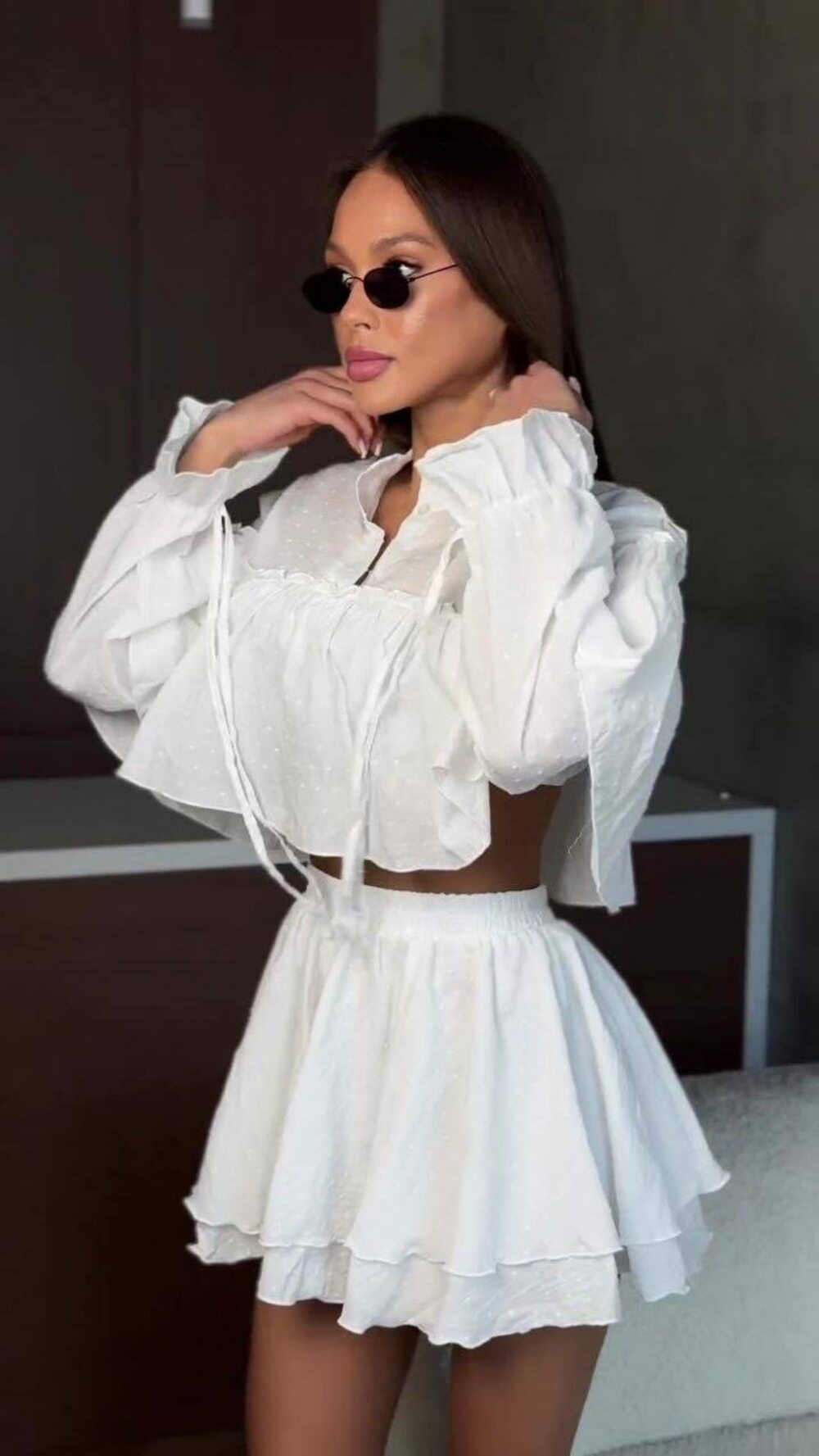 Свободный белый костюм состоит из укороченной блузы с длинными рукавами и мини-юбки. Блуза украшена рюшами и завязками, а юбка имеет многослойный крой. Легкая ткань придает образу воздушность и элегантность.