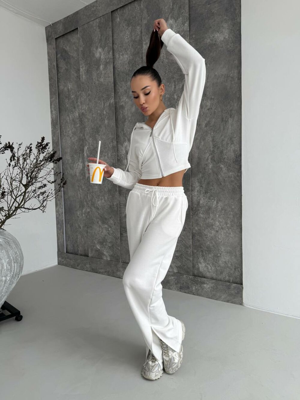 Нереально крутой и стильный костюм: брюки-палаццо с разрезом и укороченная кофта на молнии. Цвет молочный.