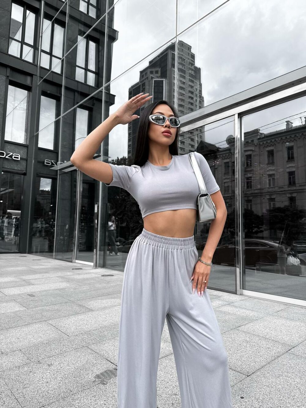 Стильный женский костюм, состоящий из укороченного облегающего кроп-топа с короткими рукавами и свободных прямых брюк с высокой посадкой и эластичным поясом. Изготовлен из мягкой, лёгкой вискозной ткани, которая приятно ощущается на теле и красиво струится. Идеален для прогулок и повседневных образов. Цвет серый.