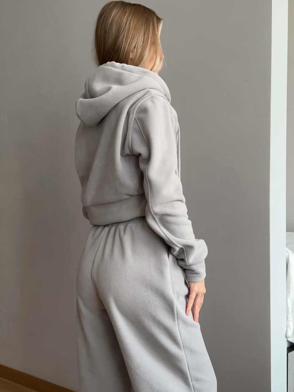 Флисовый спортивный костюм-двойка: укороченная кофта на молнии с капюшоном и широкие брюки на резинке с затяжкой. Мягкий поларфлис, уютный и тёплый на каждый день.