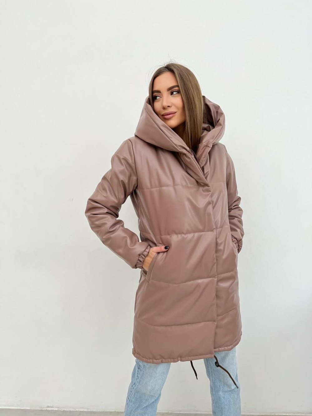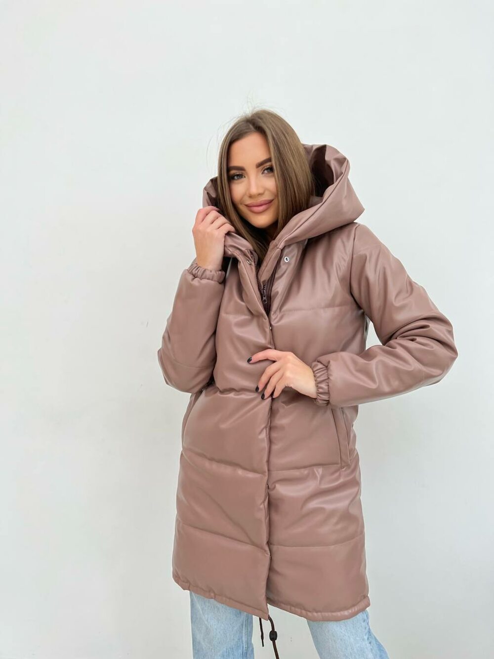 Очень популярная курточка коричневого цвета, в качественном исполнении с правильной лекало формой, что обеспечивает отличную посадку при носке, так же большой плюс в том что в этой модели присутствует капюшон, в зимнюю погоду это большой плюс, в это модели используется кань из эко-кожи, а наполнитель силикон, поэтому она не продуваемая и очень теплая, все вместе позволяет вам ощущать себя в тепле, но при этому быть модной и не повторимой.