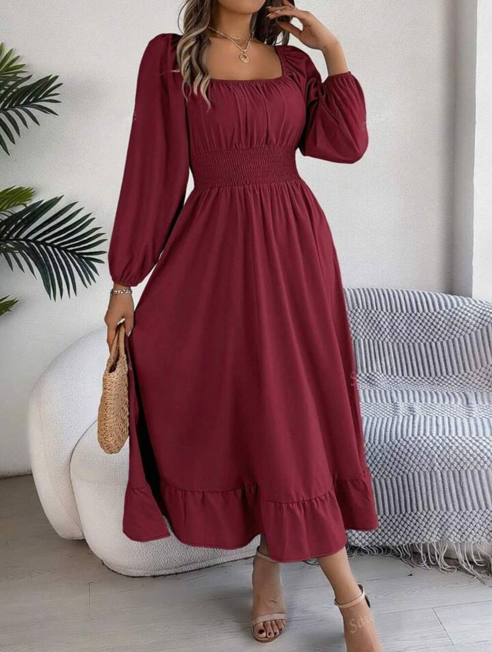 Стильное платье-макси с длинным рукавом, квадратное декольте, талия на резинке, цвет бордовый