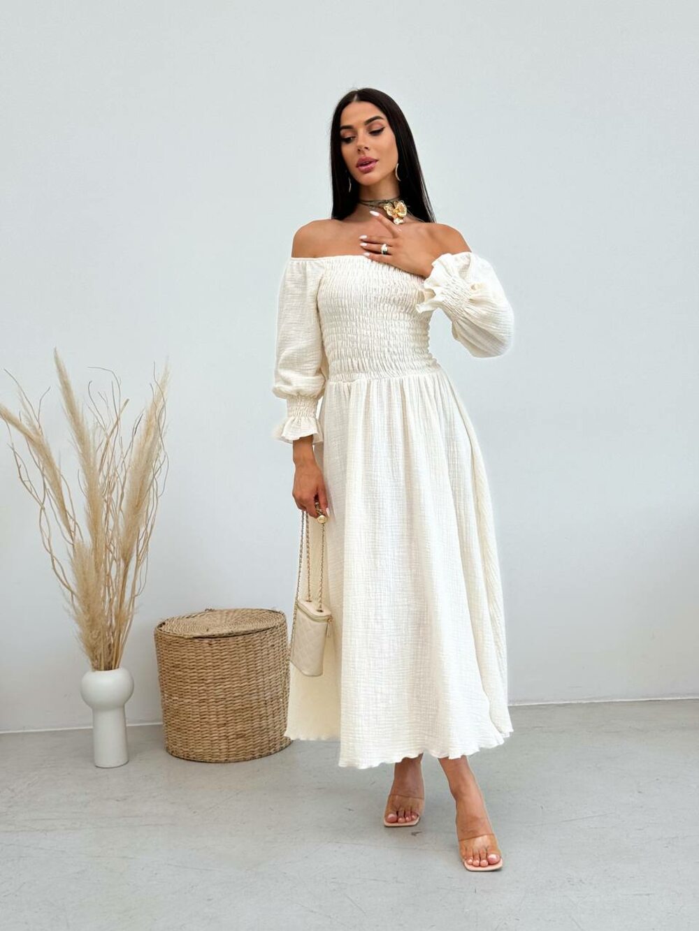 Идеальное лёгкое платье на резиночке с разрезом на ноге. Отлично подойдёт под любую обувь, очень лёгкое и удобноею. Можно носить с открытым или закрытым плечом. Цвет бежевый.