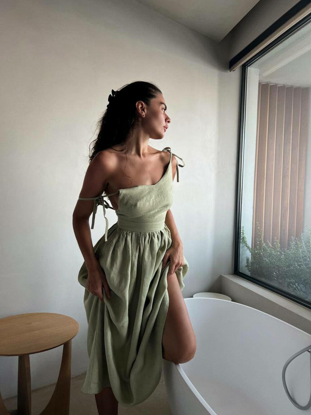 Летнее платье на бретельках с открытой спиной и объемной юбкой. Цвет оливковый.