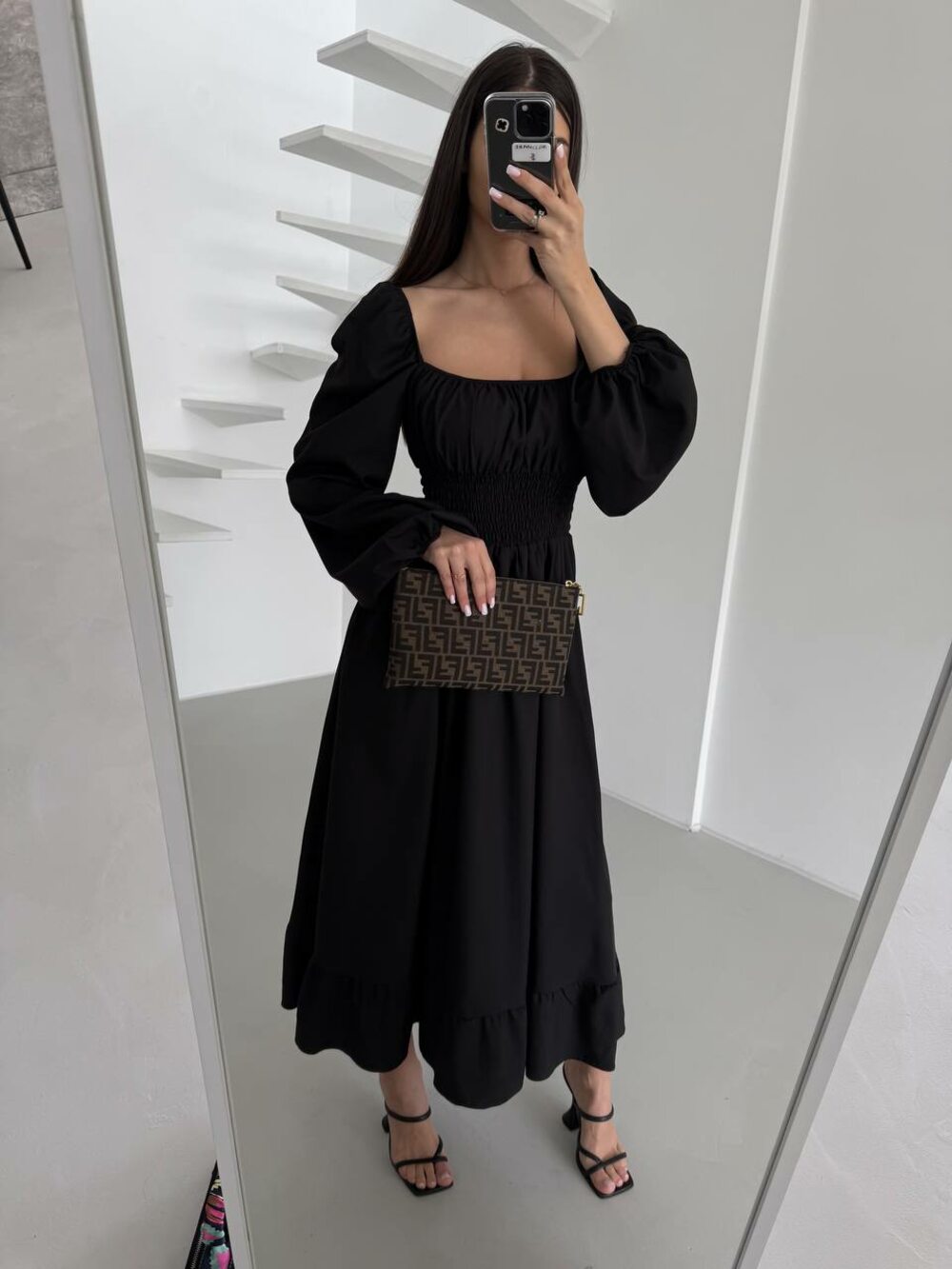 Элегантное платье миди с длинными рукавами и квадратным вырезом подчёркивает талию благодаря широкой резинке. Низ платья украшен воланом, придающим образу женственность и лёгкость. Цвет черный.
