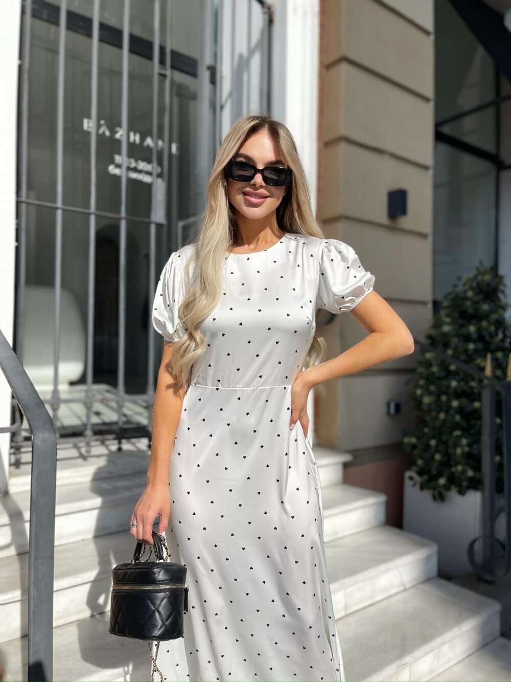 Платье миди-длины из шелка с принтом в мелкий горошек, красиво струится и имеет лёгкий сатиновый блеск. Модель с короткими объёмными рукавами и подчёркнутой талией создаёт элегантный и утончённый образ. Платье застегивается на молнию. Цвет белый.