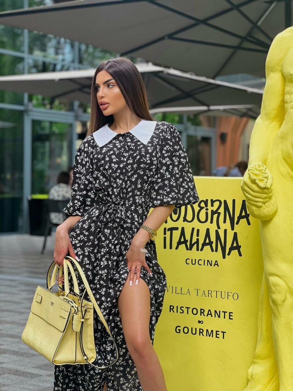Платье свободного кроя с мелким принтом, дополнено контрастным классическим воротником и поясом, подчёркивающим талию. Лаконичный фасон сочетается с выразительными деталями, создавая элегантный и современный образ. Цвет черный с белым цветком.