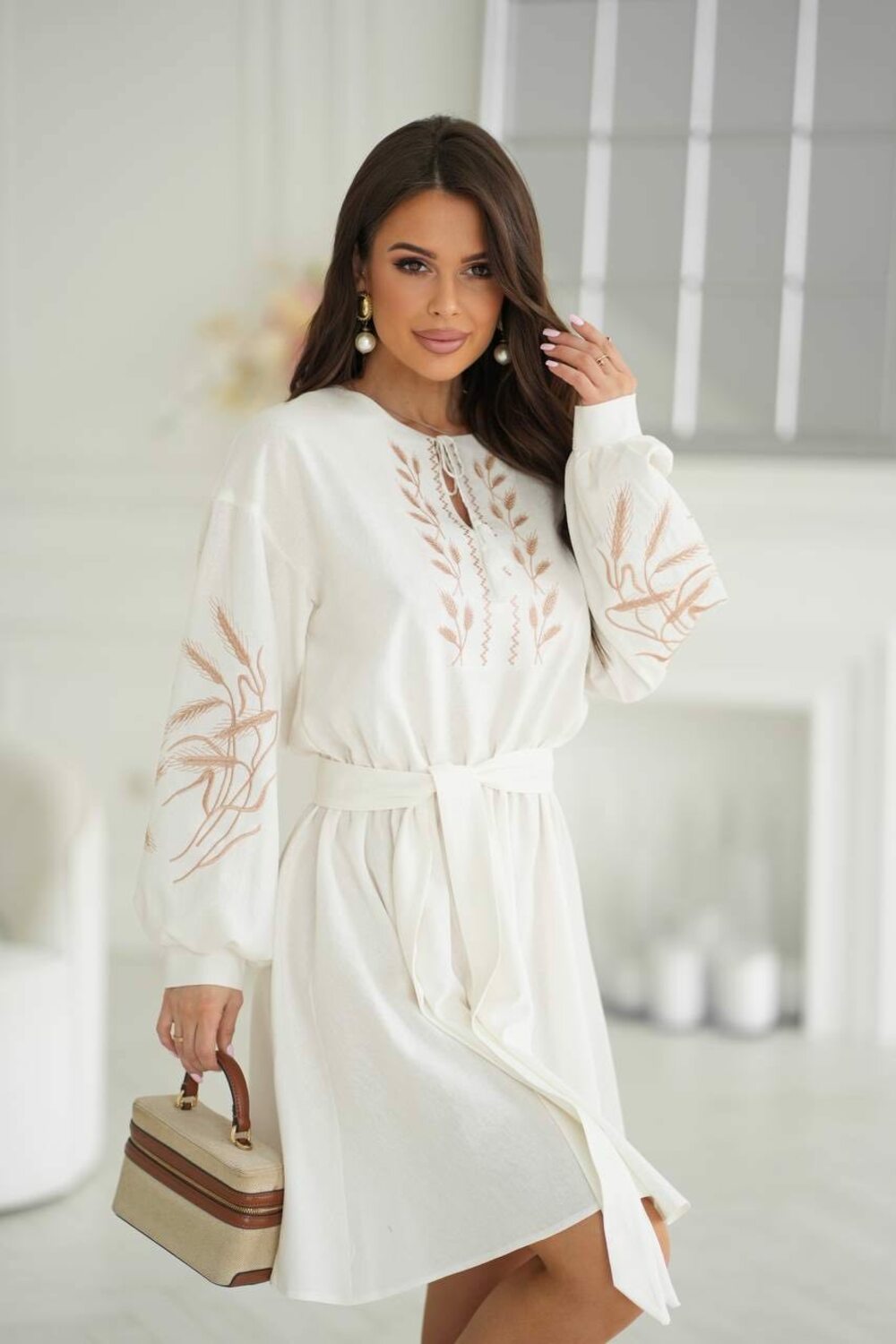 Льняное платье с расклешонной юбкой и вышивкой, талия на резинке и поясе, рукава на манжете, цвет молочный