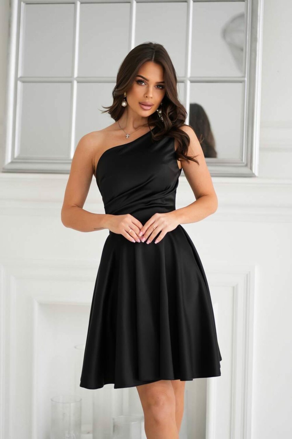 Атласное платье на одно плечо, длиной выше колен, с расклешенной юбкой «солнце». Цвет черный