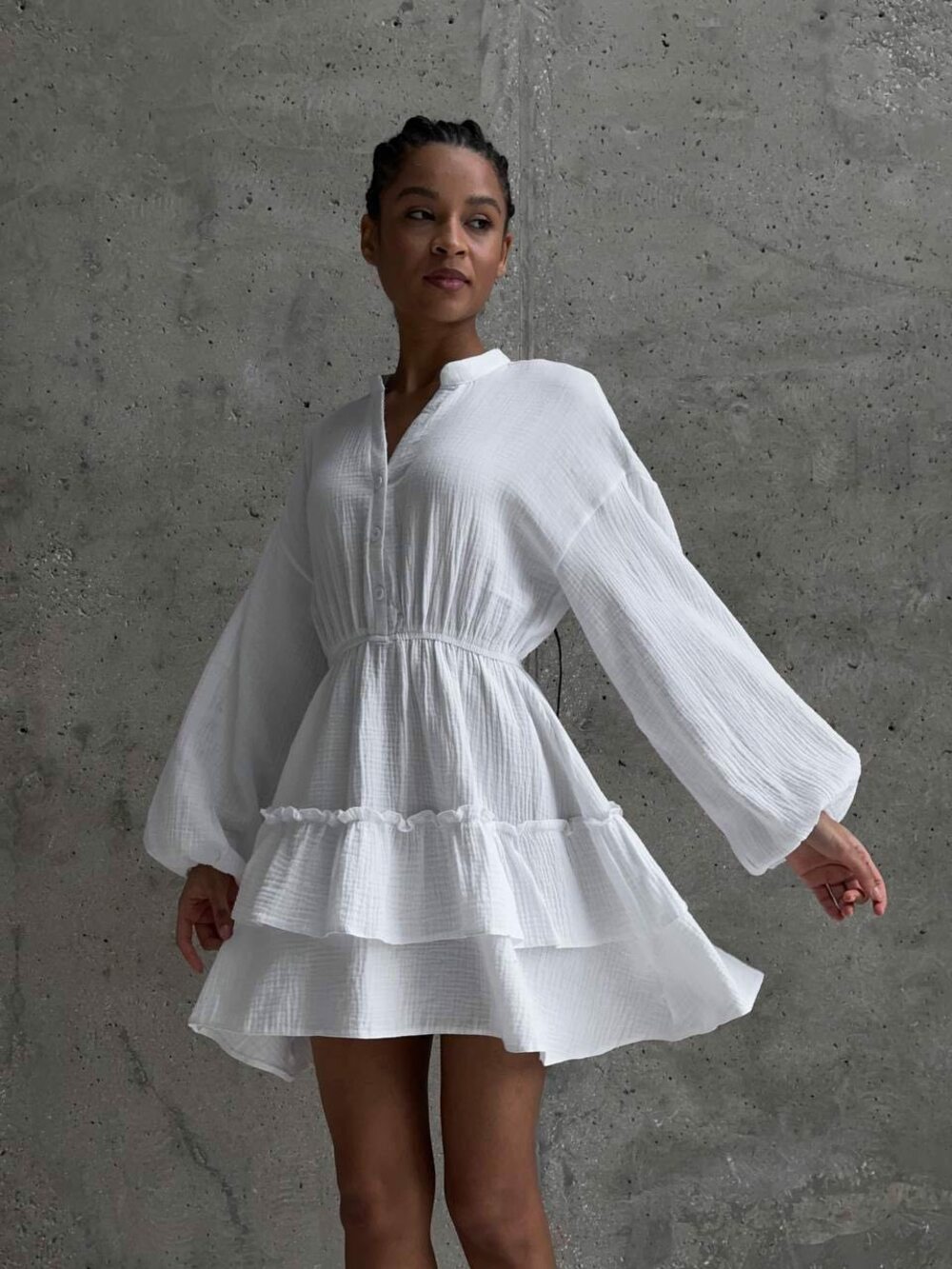 Стильное муслиновое платье. Верх застегивается на пуговицы, по низу волан рюш, талия на резинке. Цвет белый.