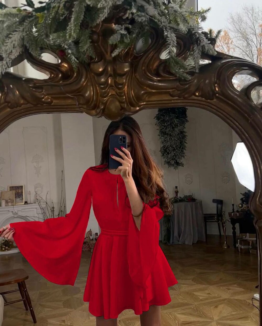 Платье с открытой спиной, длинными воздушными рукавами и юбкой солнце, цвет красный