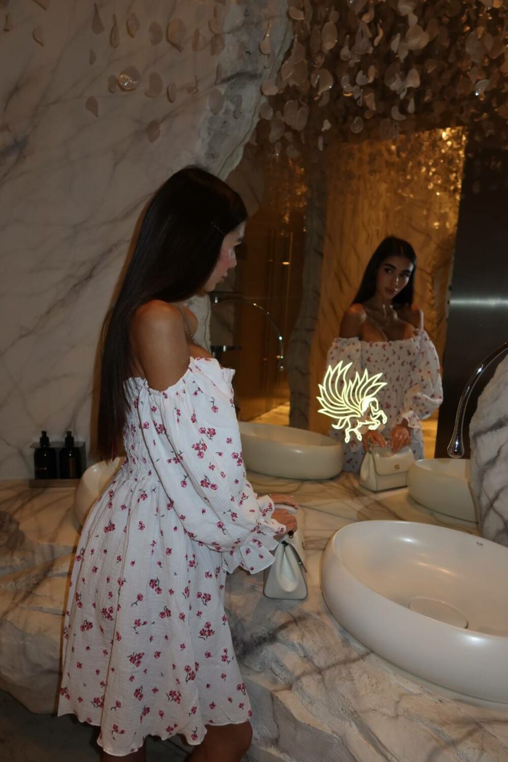 Лёгкое платье с рукавами-воланами и утягивающей резинкой на талии, которая визуально её уменьшает. Юбка придаёт изделию объём и воздушность. Очень красиво подчёркивает формы и отлично сидит по фигуре. Цвет платья белый с розовым принтом.