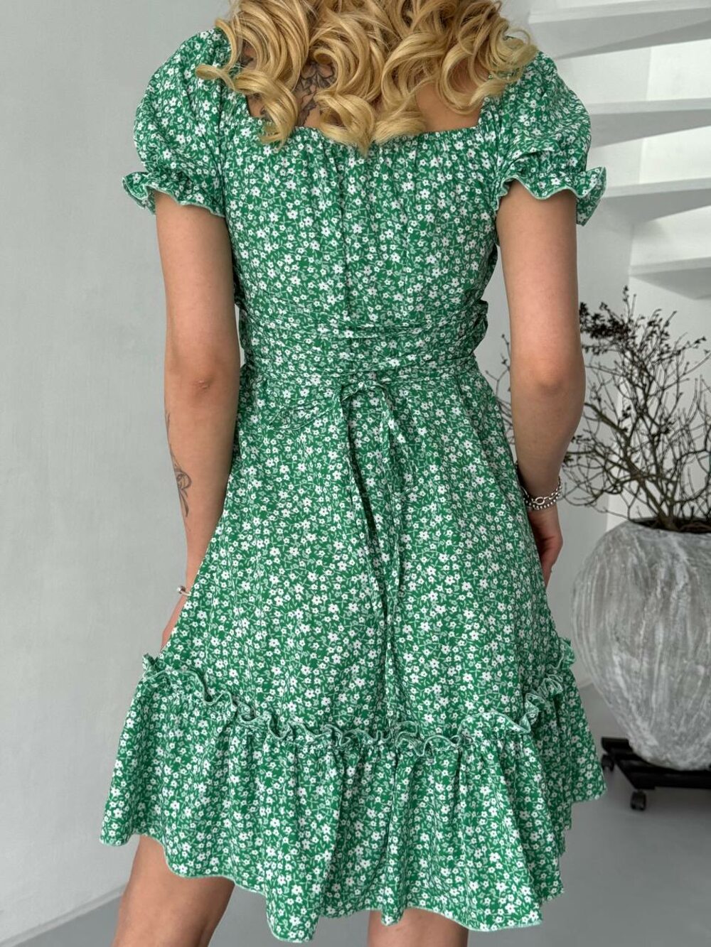 Яркое летнее платье со сборкой на шнурке в области декольте, плечи платья можно опускать создавая разные образы, низ украшен рюшами. Цвет зеленый.