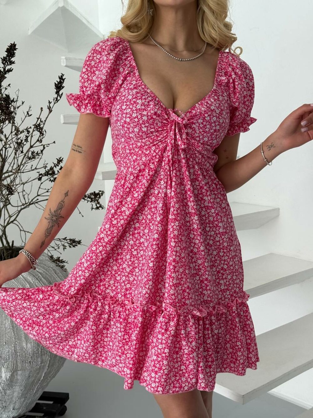 Яркое летнее платье со сборкой на шнурке в области декольте, плечи платья можно опускать создавая разные образы, низ украшен рюшами. Цвет малиновый.