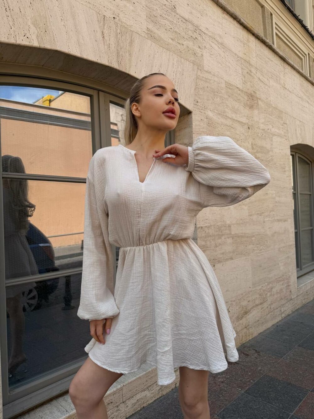 Легкое муслиновое платье с объемным длинным рукавом и резинкой на талии. Цвет молочный.