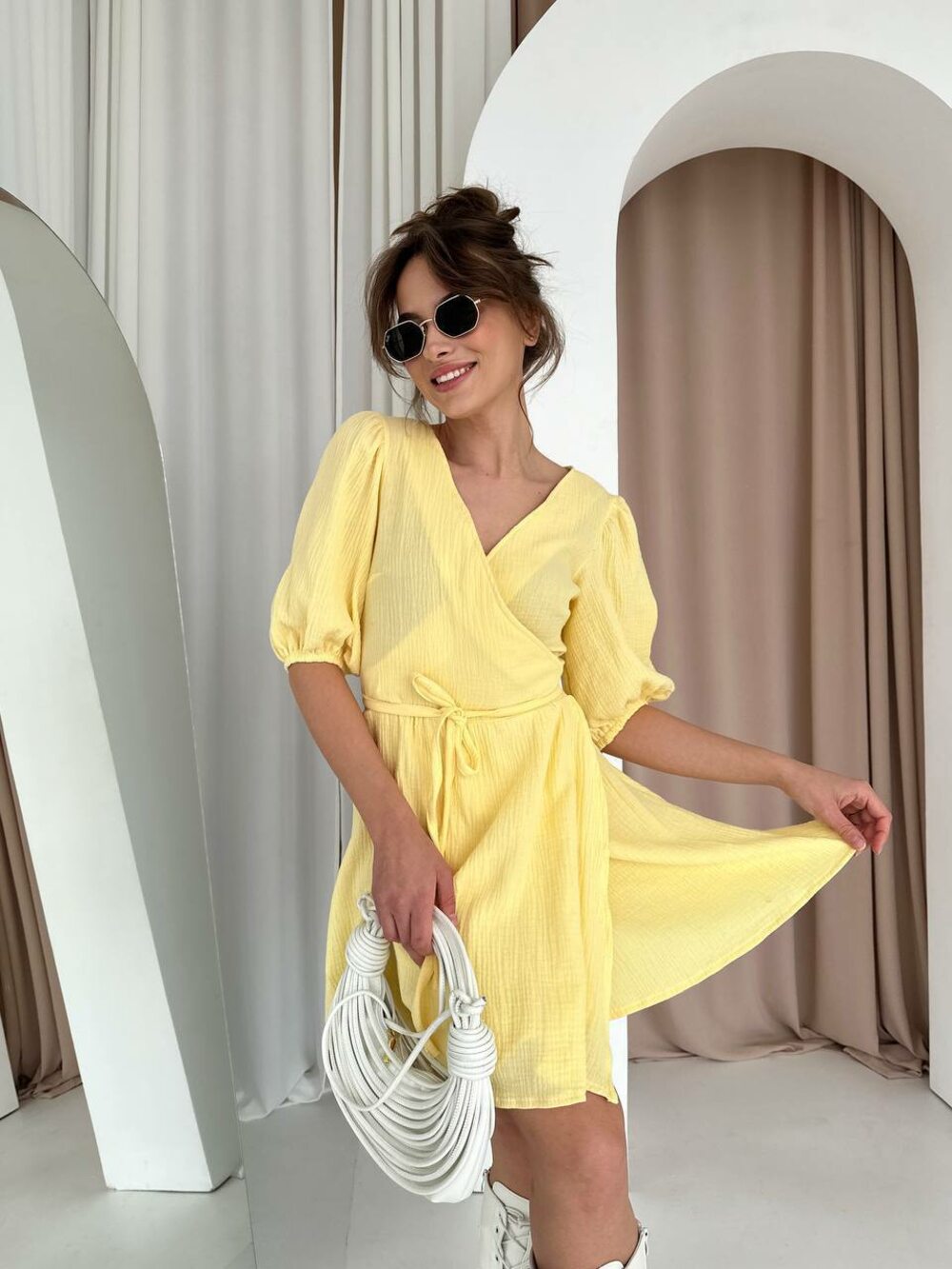 Лекгое муслиновое платье с идеальной посадкой по фигуре за счет кроя на запах. Цвет лимонный.