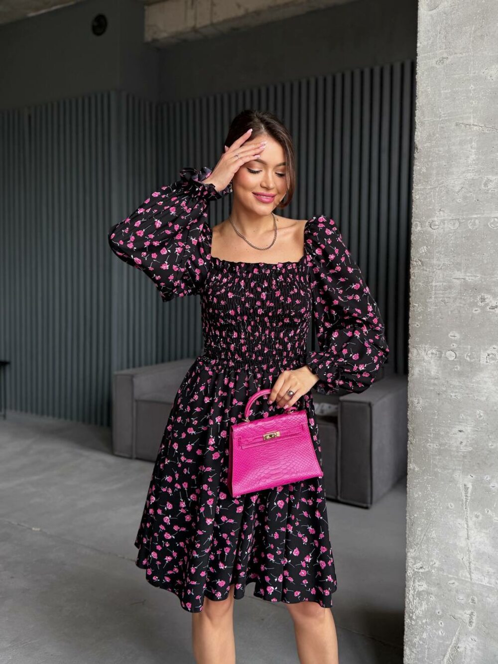Платье с цветочным принтом и нашитой резинкой на груди и спинке, рукава и плечи также на резинке, благодаря чему можно регулировать платье. Отличное качество. Цвет черный.