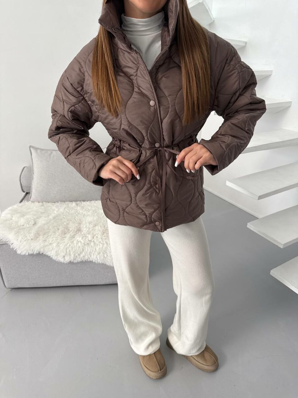 Женская стёганая куртка с акцентом на талию, цвет коричневый