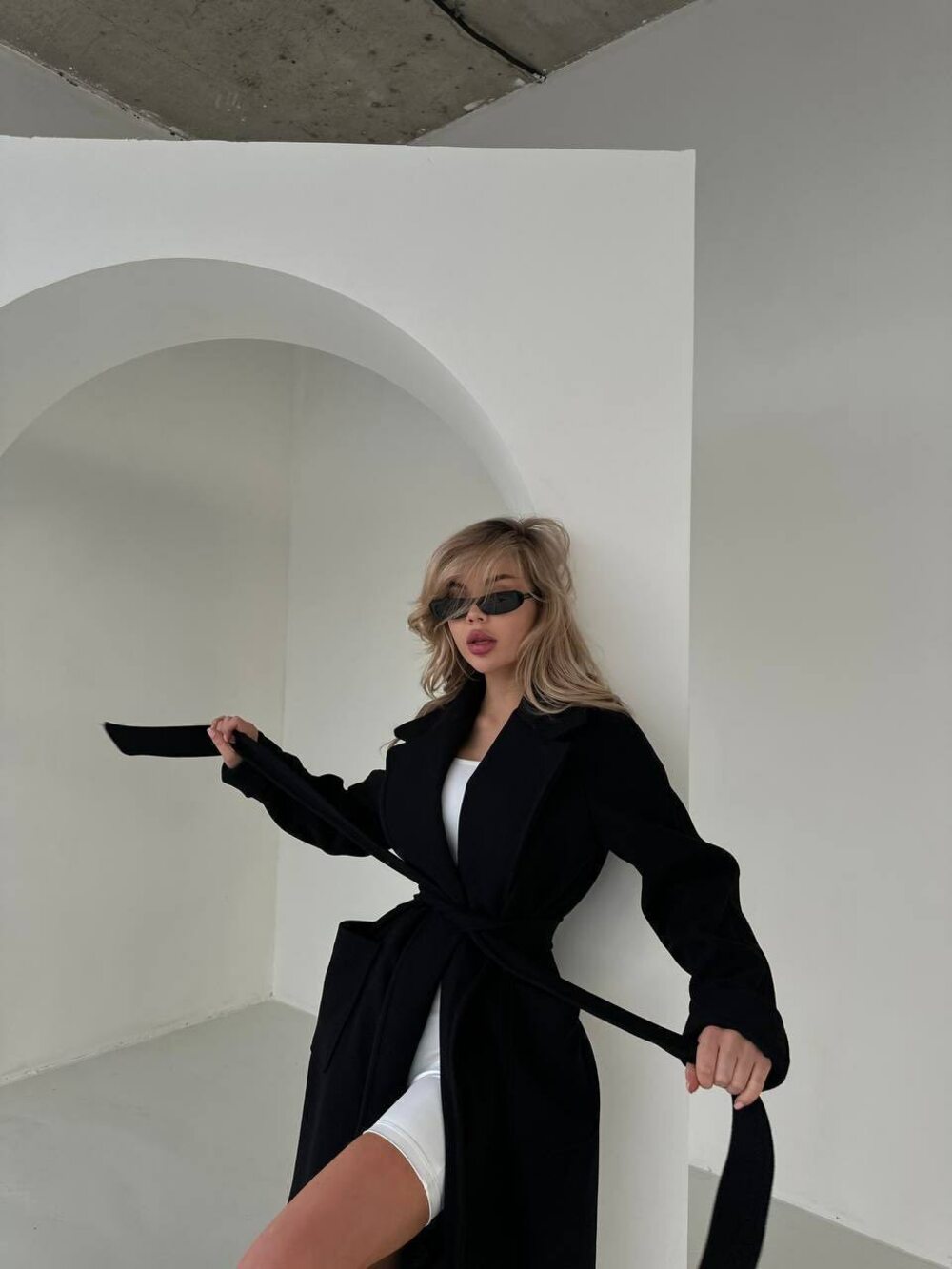 Пальто на запах с накладными карманами и пояском, цвет черный