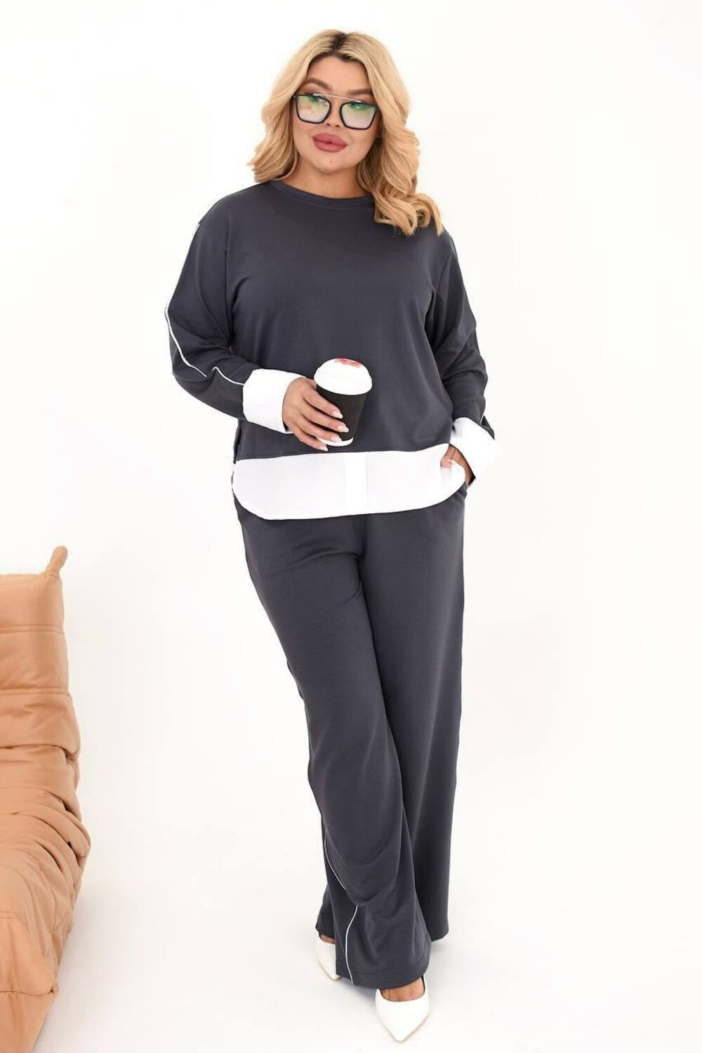 Кофта оригінального крою виконана із трикотажу з додаванням білого супер-софту на рукавах та нижній частині, створюючи ефект імітації сорочки. Штани палаццо середньої посадки на резинці з кишенями. Рукави та штани прикрашені білою стрічкою, що надає образу яскравості. Костюм стильний та зручний, його елементи легко поєднувати з різними образами. Колір графіт.