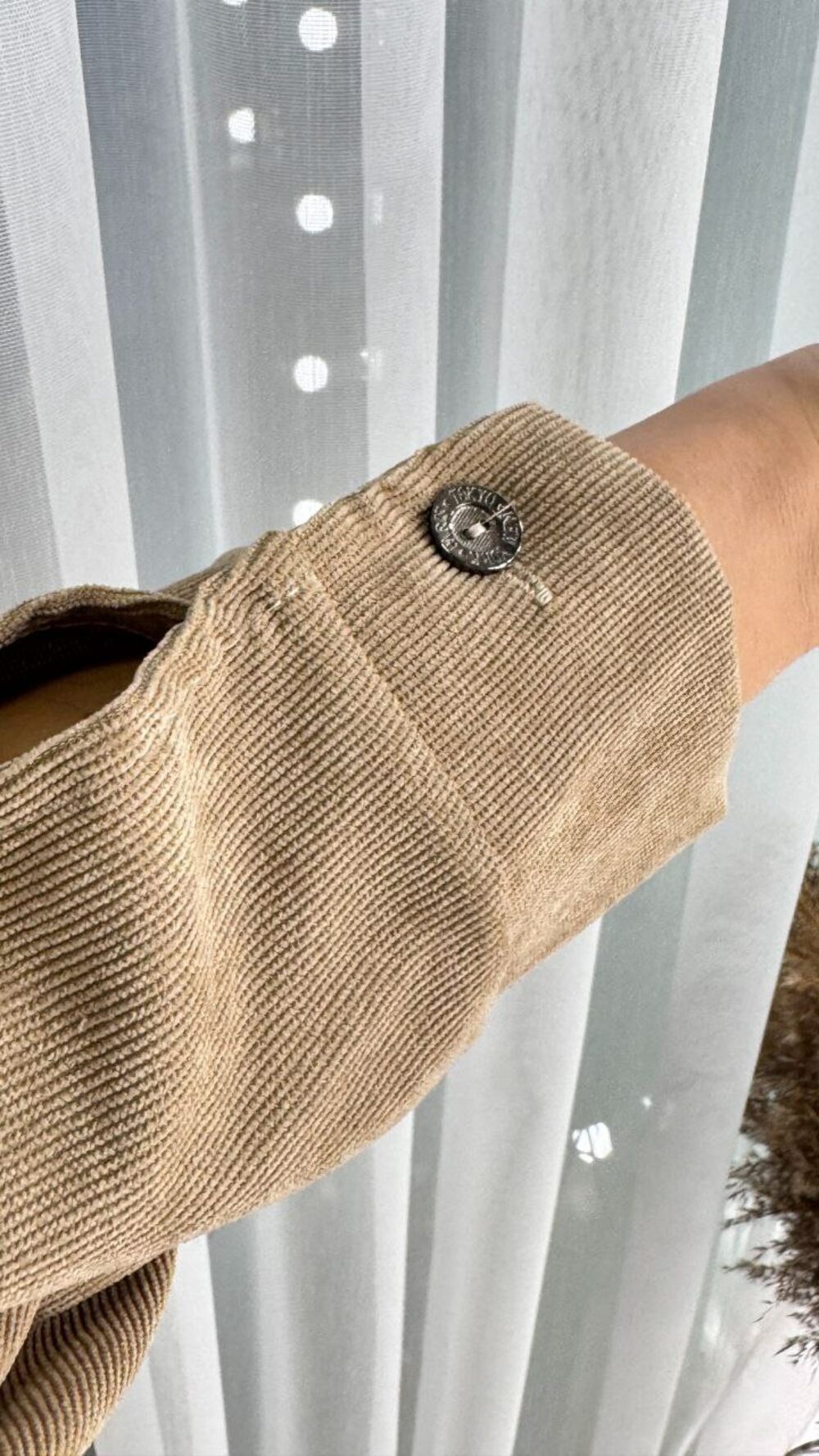 Костюм двійка складається з сорочки та спідниці. Оверсайз сорочка з кишенями на ґудзиках, пряма спідниця з потайною блискавкою позаду. Колір бежевий
