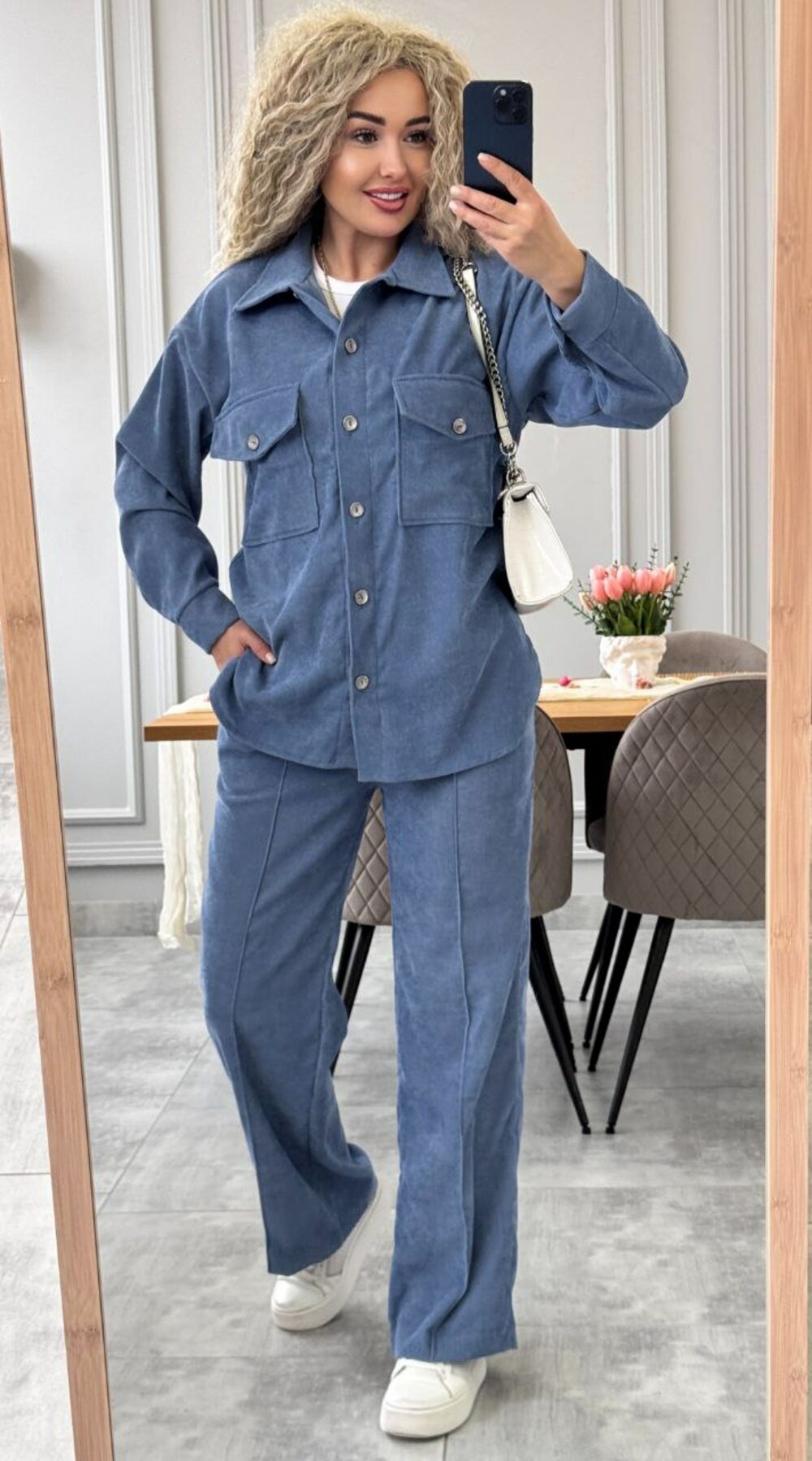 Костюм двійка складається з штанів та сорочки. Сорочка на гудзиках, кишені робітники. Штани вільного крою на гумці, з обох боків кишені. Колір блакитний.