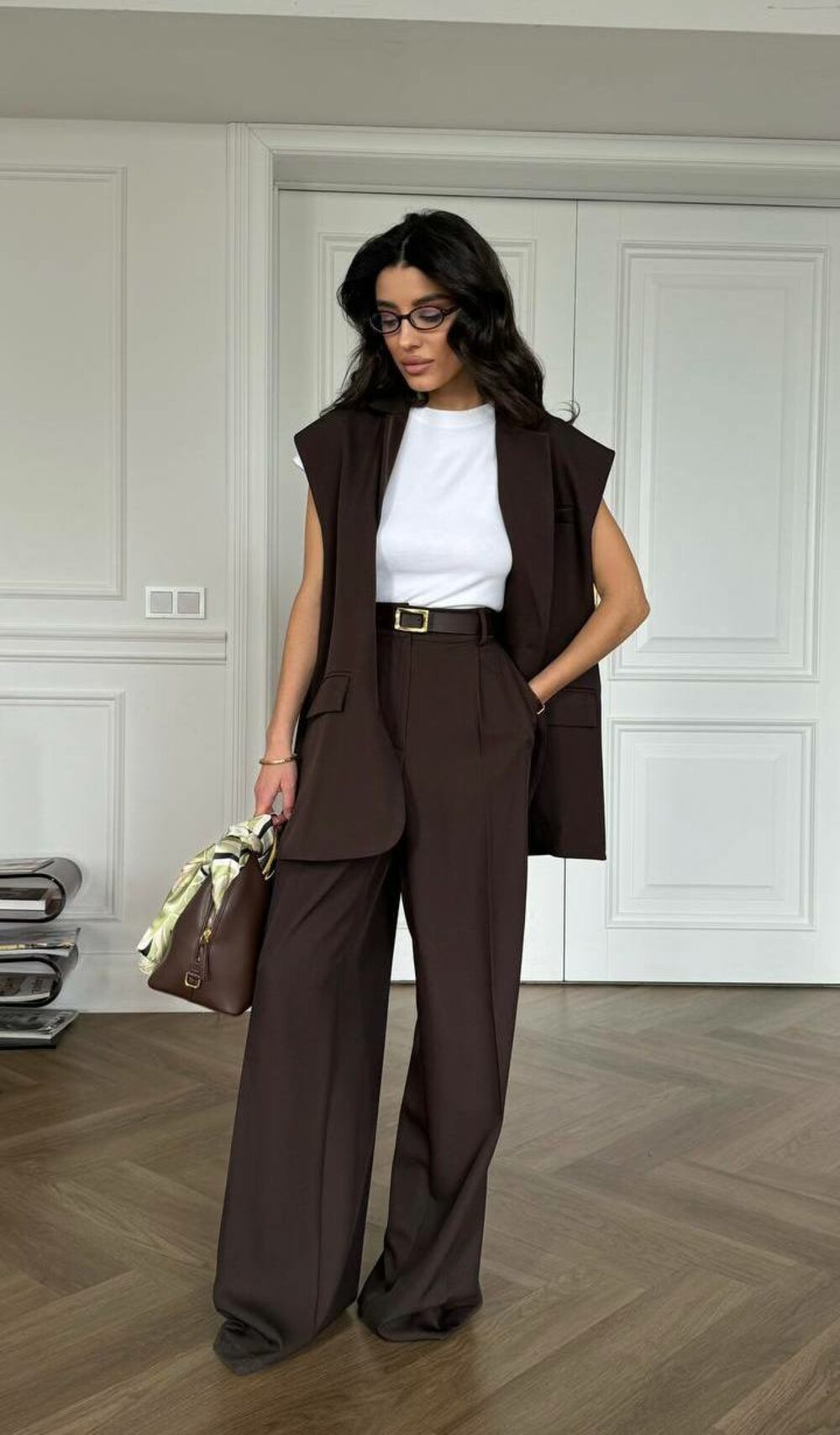 Костюм двійка: штани палаццо та жилет. Штани з високою посадкою, клеш від стегна; жилет з кишенями, вільного крою, застібається на гудзик. Костюм виконаний із якісної тканини. Колір шоколад.