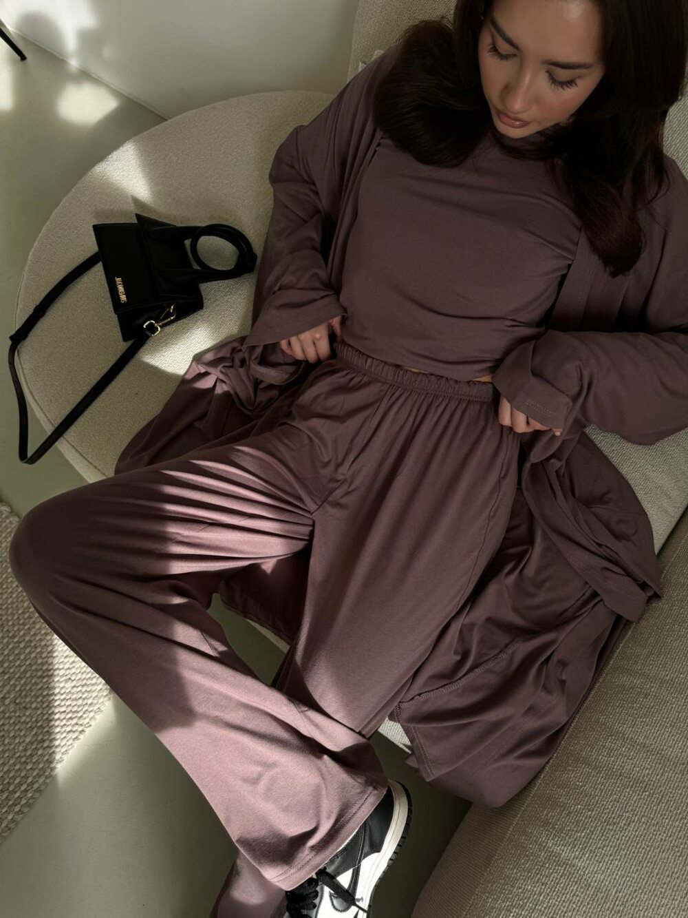 Стильний костюм трійка складається з лонслива, штанів вільного крою на високій посадці з гумкою на талії та легкого кардигану. Колір кавовий.