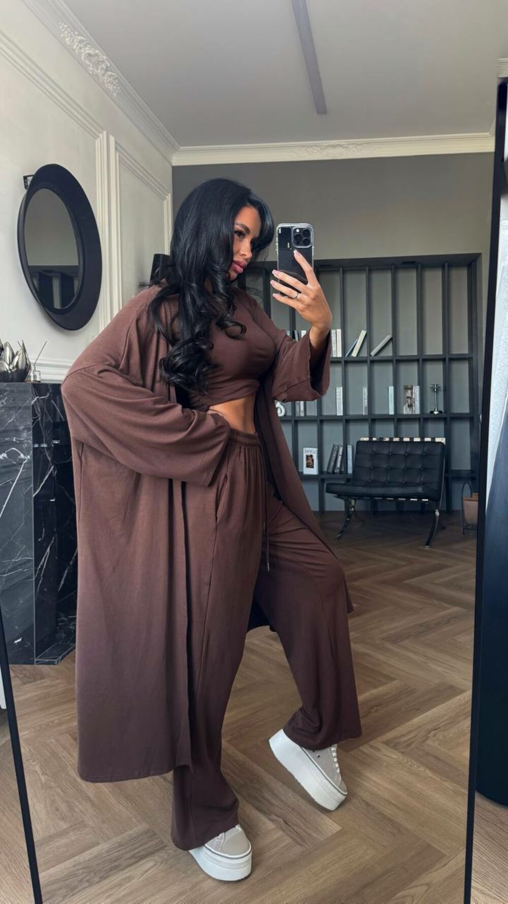 Костюм трійка складається з кардигану, брюї та топу, колір коричневий