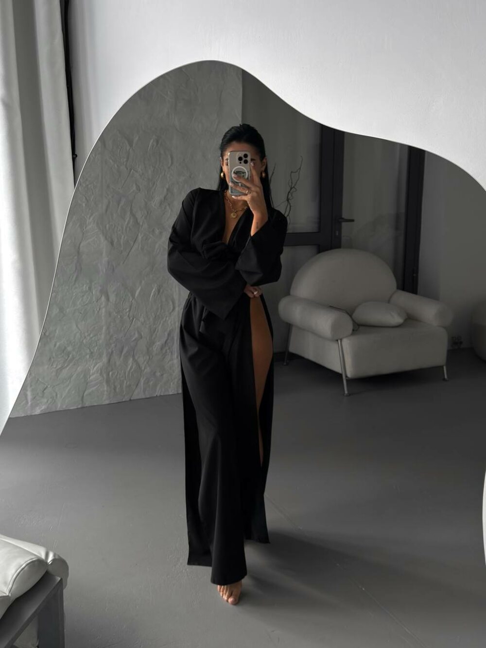 Костюм із штанів та блузки. Штани з розрізами з боків та блуза із зав'язками на грудях. Ідеально для дому, пляжу та міського образу. Колір чорний.