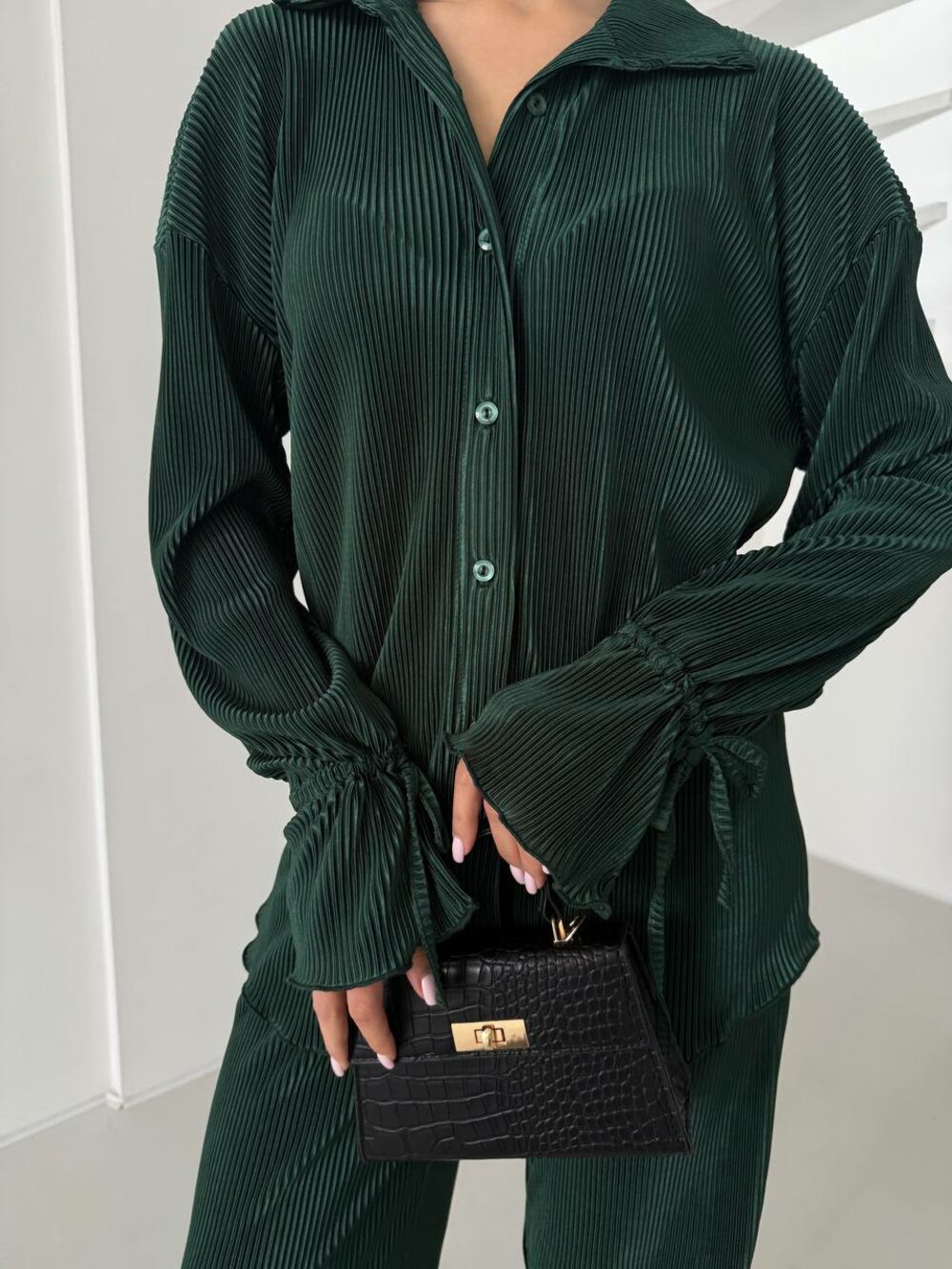 Костюм двійка складається зі штанів і сорочки вільного крою, колір смарагд
