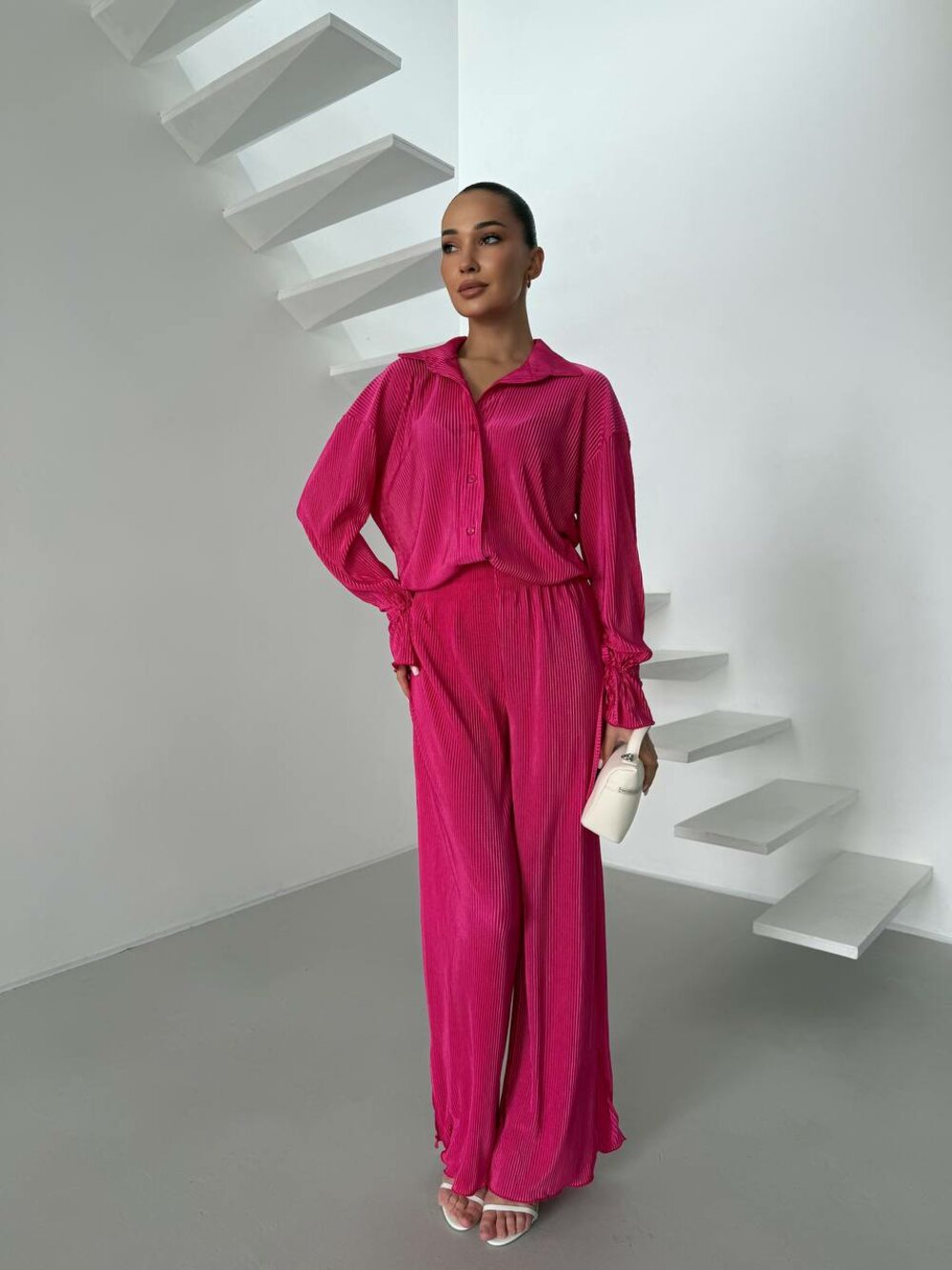 Костюм двійка складається зі штанів і сорочки вільного крою, колір малиновий