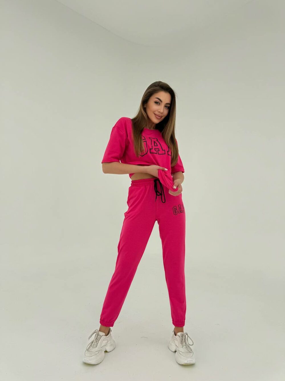 Костюм двійка складається з футболки вільного крою з написом та штанів з гумкою на талії та внизу, колір малиновий
