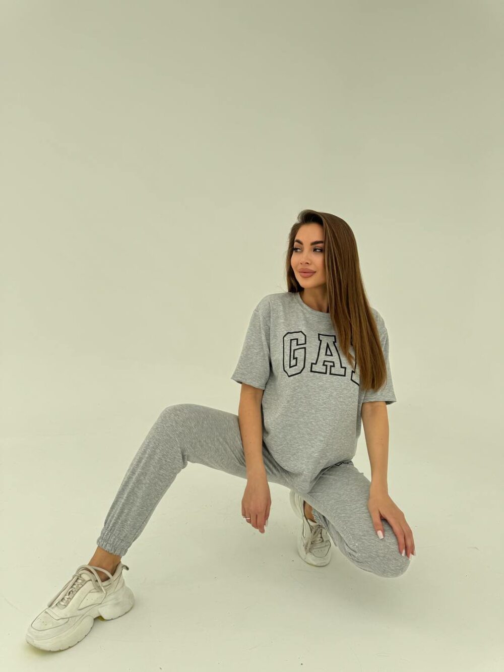 Костюм двійка складається з футболки вільного крою з написом і штанів з гумкою на талії та внизу, колір сірий