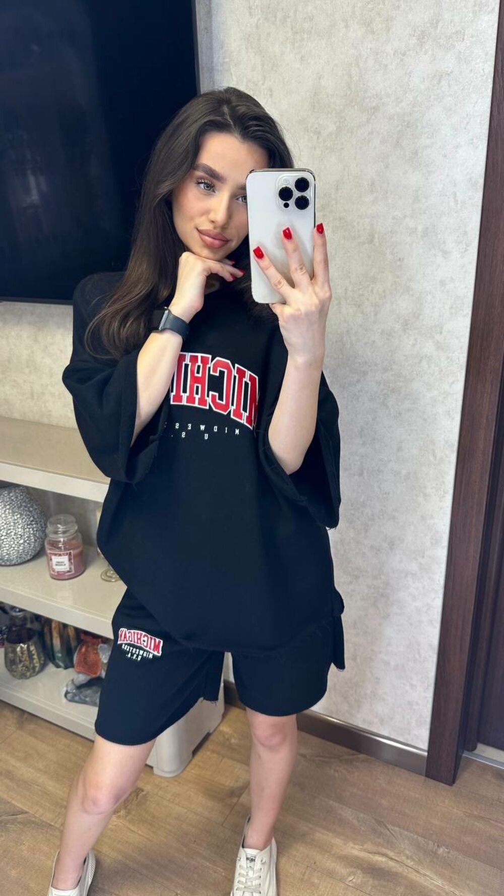 Літній костюм двійка, який складається з футболки оверсайз із написом “MICHIGAN” та шорт вільного крою з гумкою на талії та кишенями. Колір чорний.