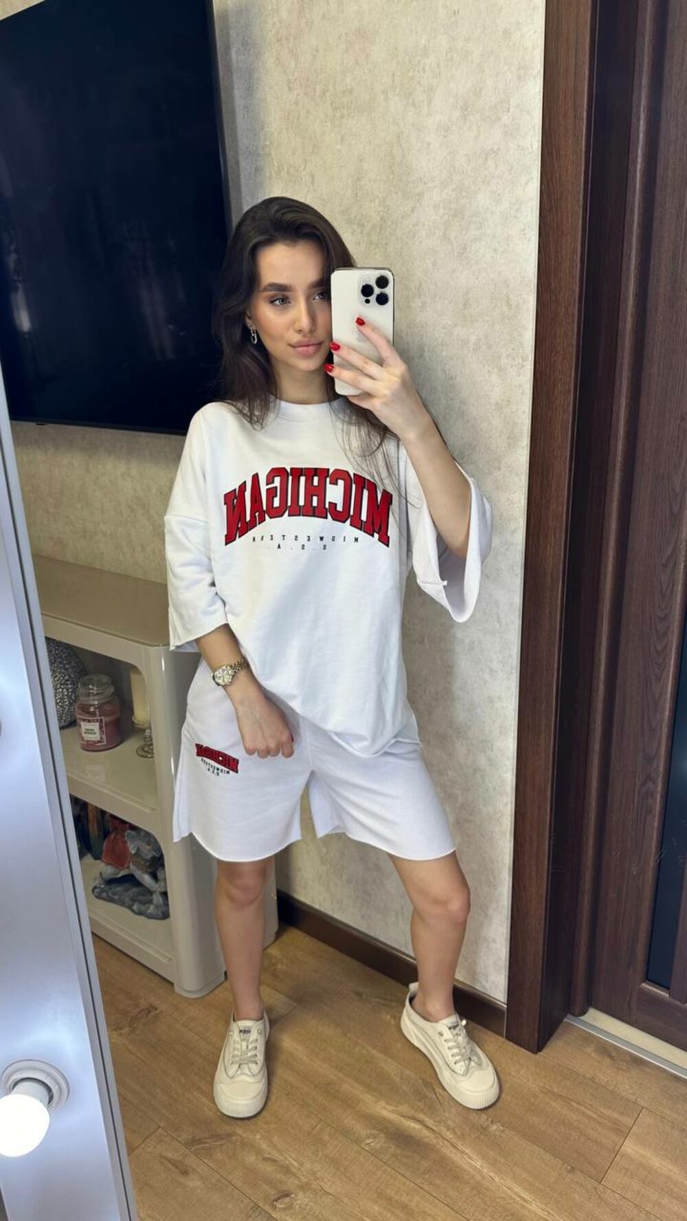 Літній костюм двійка, який складається з футболки оверсайз із написом “MICHIGAN” та шорт вільного крою з гумкою на талії та кишенями. Колір білий.