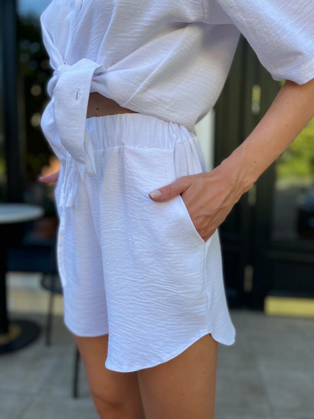 Легкий літній костюм двійка, який складається з сорочки вільного крою з коротким рукавом та шорт із гумкою на талії. Колір білий.