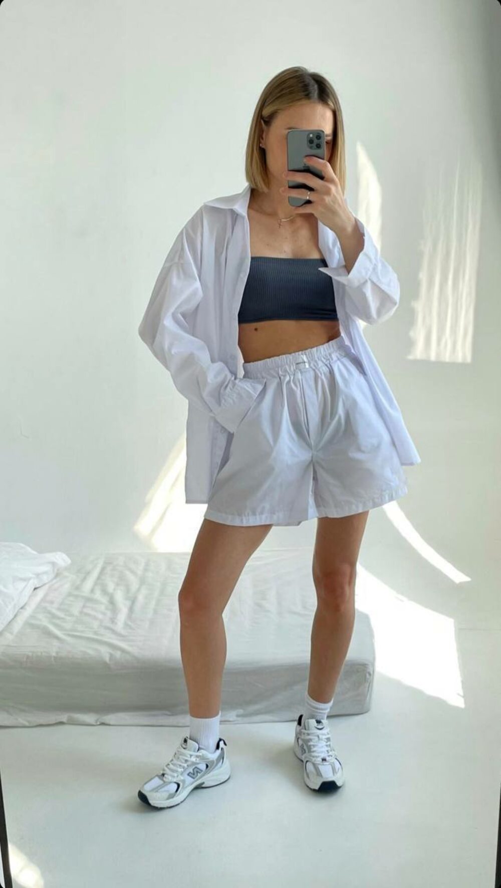 Легкий костюм – незамінна річ у твоєму літньому гардеробі. Оверсайз сорочка та шорти з високою посадкою. Колір білий.
