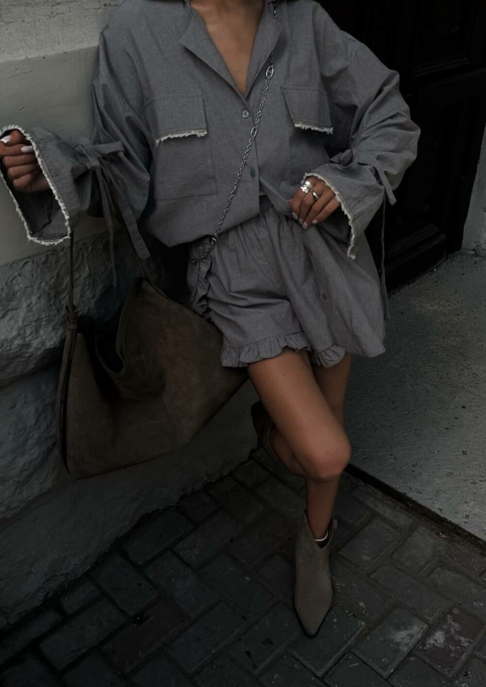 Легкий костюм у ніжному відтінку – ідеальний вибір для міських прогулянок чи відпустки. Оверсайз сорочка з накладними кишенями, декоративними воланами та зав'язками на рукавах – для тих, хто цінує стиль та комфорт. Шорти з м'якими рюшами додають образу романтичності. Тканина легка, приємна до тіла, добре дихає. Поєднуй з черевиками, як на фото, або з шльопками - відмінно виглядає в будь-якому варіанті. Колір сірий.