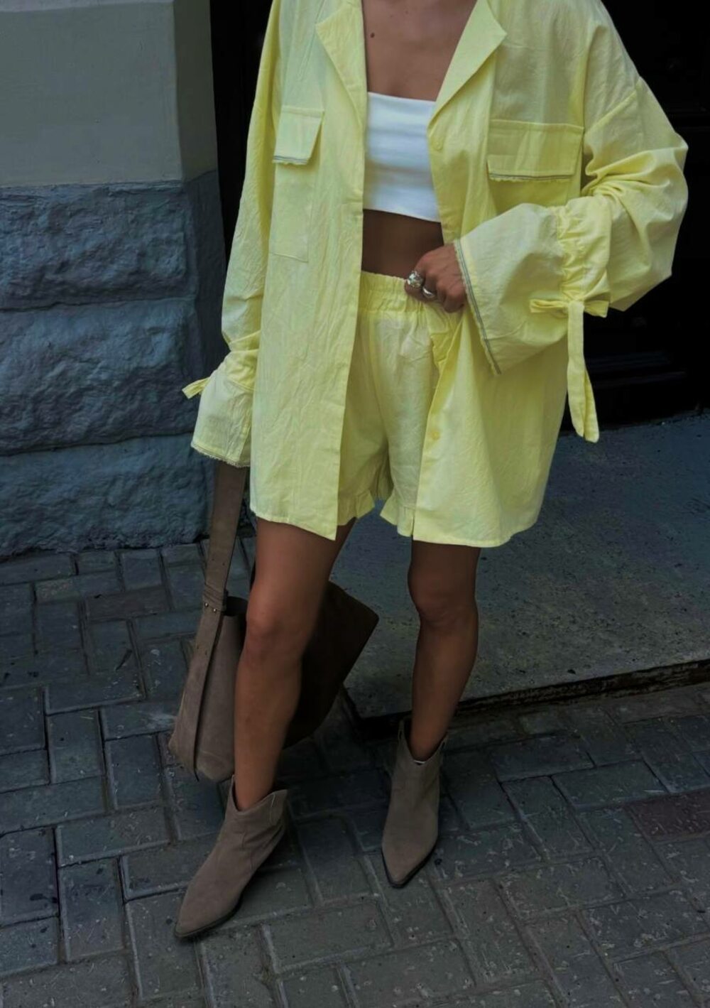 Легкий костюм у ніжному відтінку – ідеальний вибір для міських прогулянок чи відпустки. Оверсайз сорочка з накладними кишенями, декоративними воланами та зав'язками на рукавах – для тих, хто цінує стиль та комфорт. Шорти з м'якими рюшами додають образу романтичності. Тканина легка, приємна до тіла, добре дихає. Поєднуй з черевиками, як на фото, або з шльопками - відмінно виглядає в будь-якому варіанті. Колір лимонний.