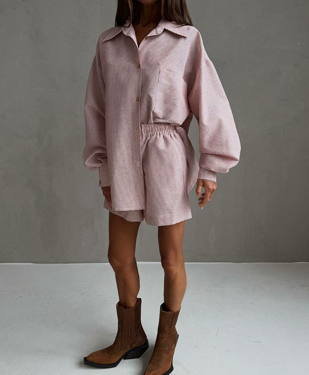 Стильний костюм із сорочки вільного крою та шорт у тонку смужку, виконаний з легкої дихаючої тканини. Ідеально підходить для комфортних повсякденних образів та літніх прогулянок. Колір смужки бордо. Розміри 42-44 | 44-46 Груди: 83-89 см | 90-97 см Талія: 60-66 см | 66–74 см Стегна: 88–94 см | 95-102 см