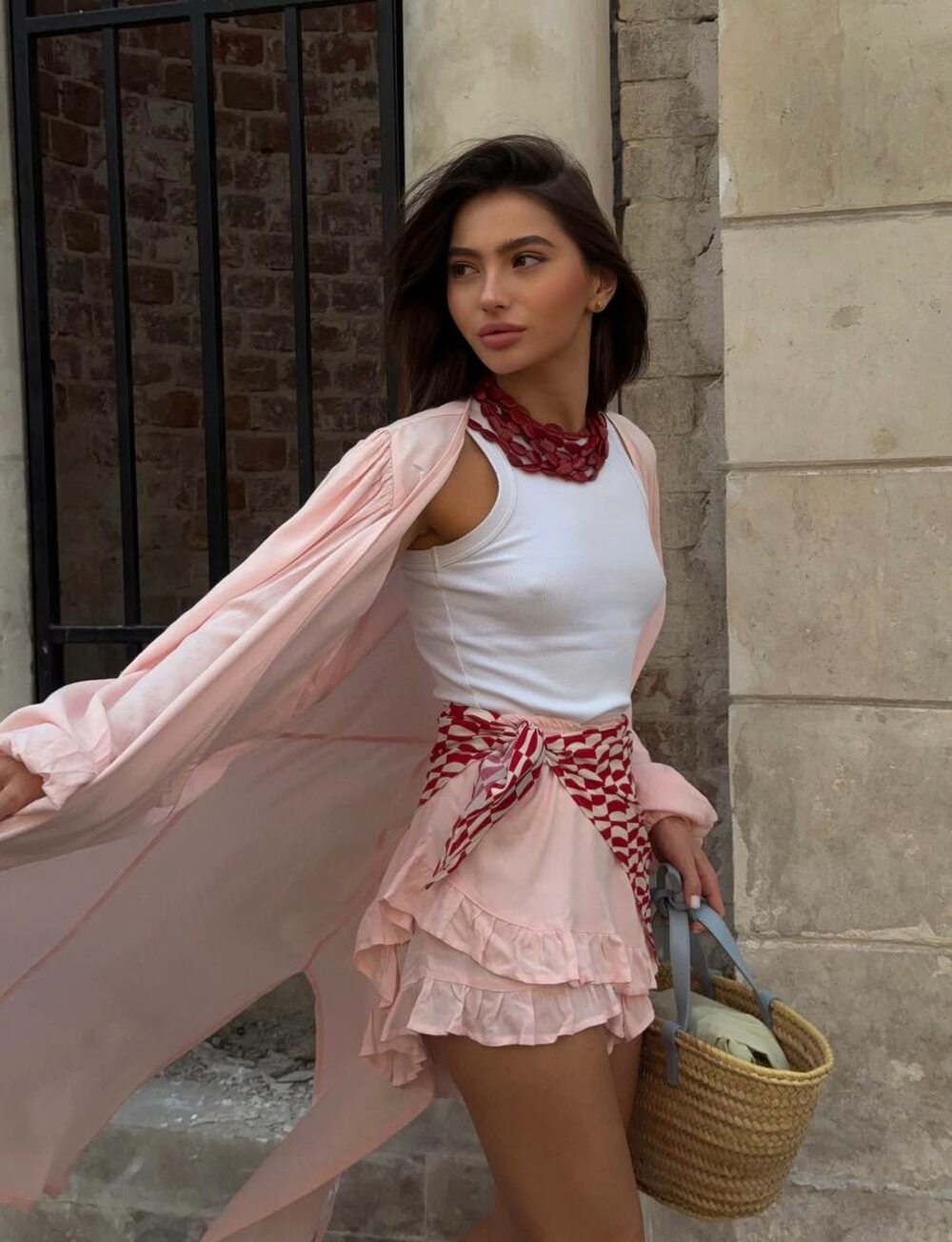 Легкий кардиган з довгими вільними рукавами та повітряним кроєм, який гарно струмує під час руху. Міні-спідниця в тон з м'якими рюшами внизу створює романтичний і жіночний образ. Колір персиковий. Розміри 42-44 | 44-46 Груди: 83-89 см | 90-97 см Талія: 60-66 см | 66–75 см Стегна: 88–94 см | 95-102 см