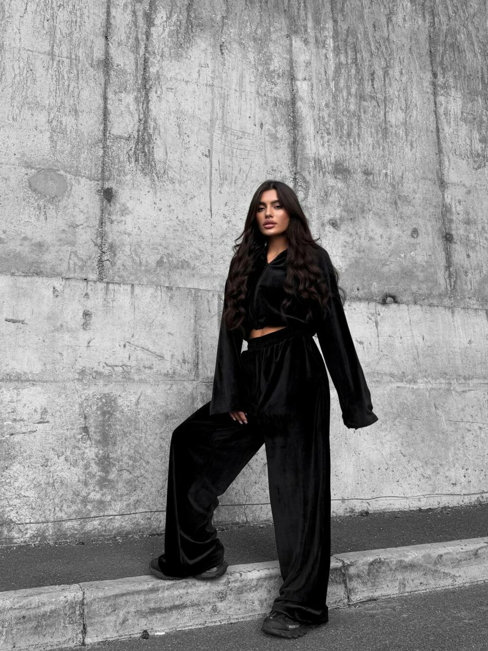 Костюм з велюру найвищої якості. Подвійний каптур, кофта на утяжках - регулюється довжина та ширина. Колір чорний. Довжина брюк - 110 см. Розмір 42-44 Обхват грудей: 82-87 см Обхват талії: 62-67 см Обхват стегон: 90-95 см Розмір 46-48 Обхват грудей: 87-93 см Обхват талії: 67-74 см Обхват стегон: 67-74 см
