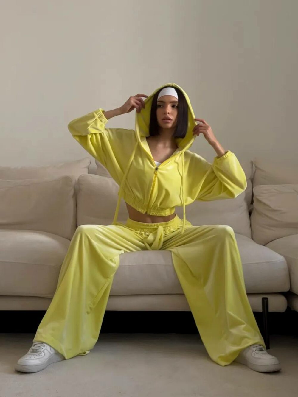М'який та приємний до тіла костюм з велюру точно стане вашим коханим завдяки своїй універсальності. Кожну частину костюма можна носити окремо. Колір жовтий.