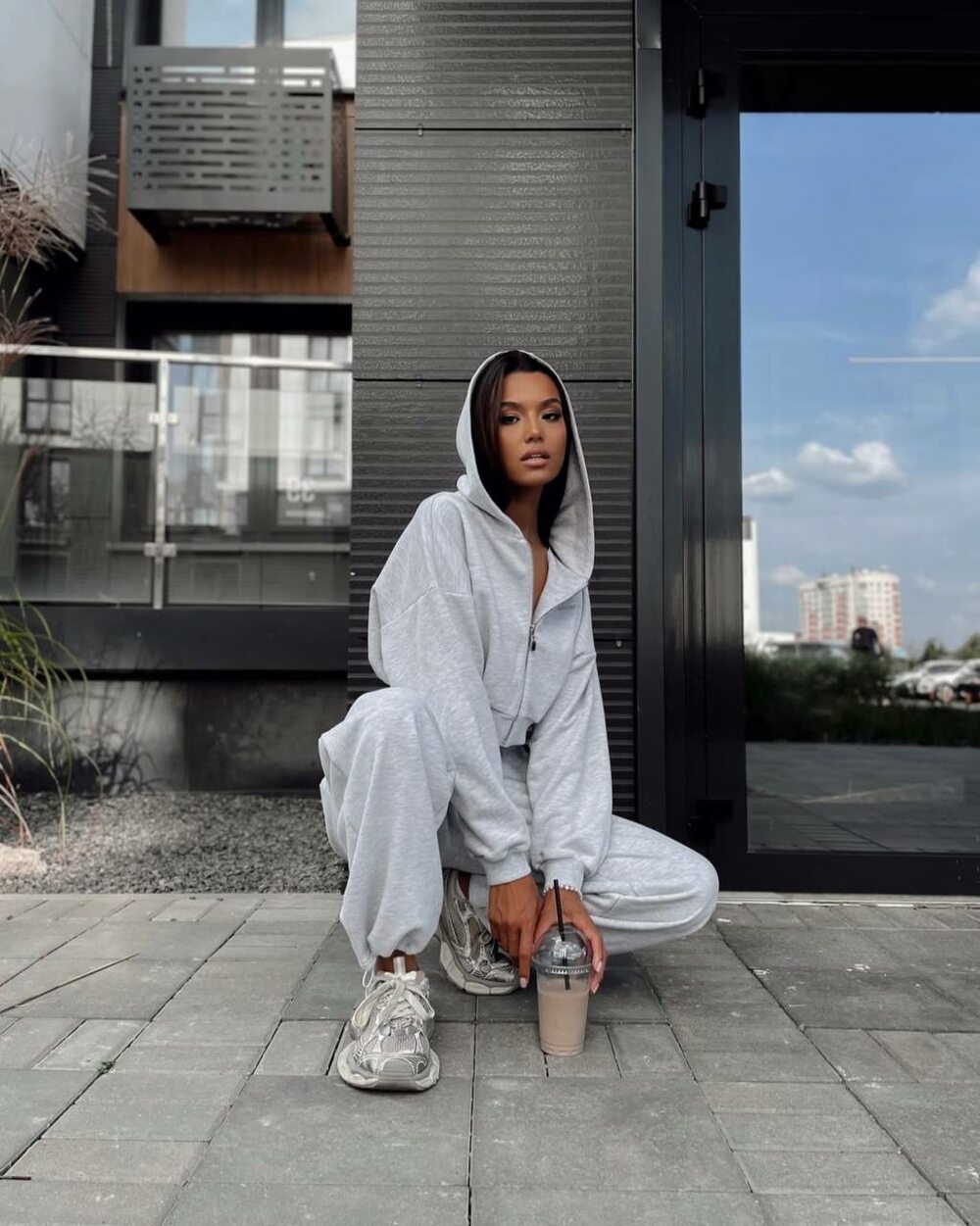 Костюм з м'якої тканини складається з укороченої кофти на блискавці та вільних штанів з гумкою на талії. Штани мають утяжки внизу, що дозволяють регулювати посадку по довжині. Образ виглядає одночасно затишно та стильно, підкреслюючи легкість та комфорт. Колір меланж.